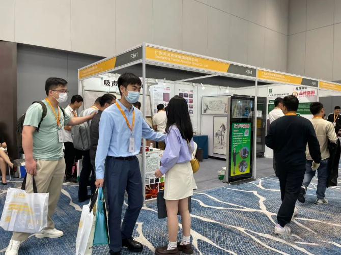 來自佛山本土品牌—天戈聲學,帶來了槽孔吸聲板、吸聲軟包類、空間吸聲體類、槽鋁吸音板、紅色玻鎂吸音板、陶晶砂吸聲板、高纖吸聲板、WGF不燃吸聲板、WCP吸音板,隔音板、隔音門,環保A級不燃吸隔聲產品等行業展品參展。