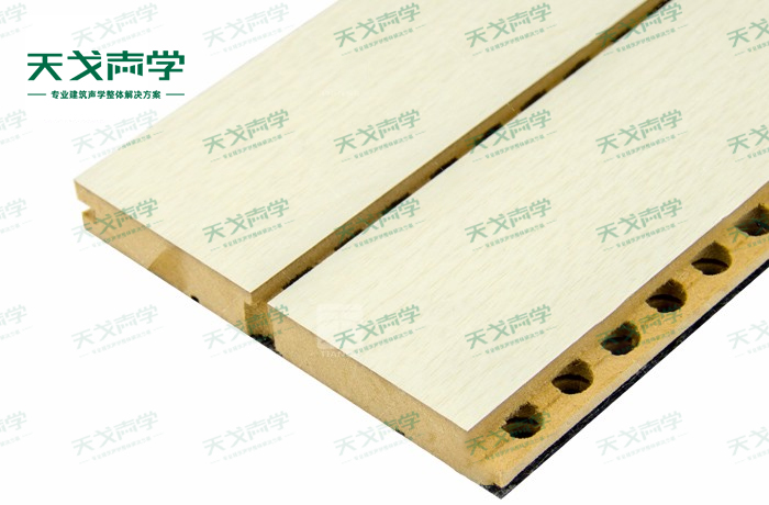 天戈報告廳槽木吸音板是一種在密度板的正面開槽、背面穿孔的狹縫共振吸音材料。報告廳槽木吸音板對吸聲頻譜選擇性很強,對中低頻有很好的吸聲性能。若在吸聲結構后空腔填入適量的吸聲棉可提高中、高頻吸聲效果,標準化模塊設計,采用插槽、龍骨結構,安裝簡易,常用于墻面或天花裝飾。