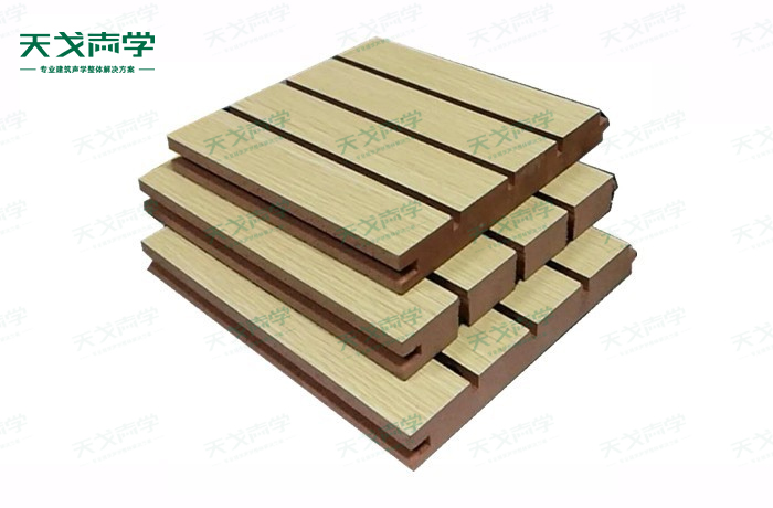 天戈報告廳硬木條吸音板是一種在密度板的正面開槽、背面穿孔的狹縫共振吸音材料。槽木吸音板對吸聲頻譜選擇性很強,對中低頻有很好的吸聲性能。若在吸聲結構后空腔填入適量的吸聲棉可提高中、高頻吸聲效果,標準化模塊設計,采用插槽、龍骨結構,安裝簡易,可用于學術報告廳建筑設計中的墻面或天花裝飾。