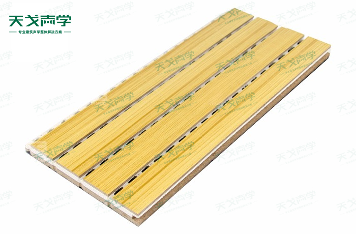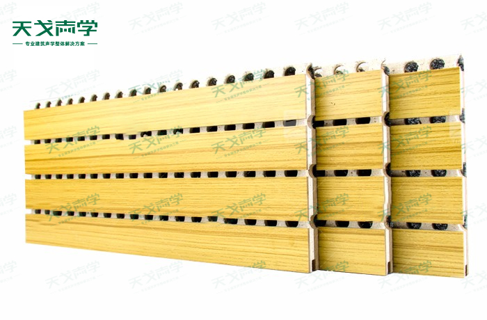 天戈復合槽木吸音板是一種在密度板的正面開槽、背面穿孔的狹縫共振吸音材料。復合槽木吸音板對吸聲頻譜選擇性很強,對中低頻有很好的吸聲性能。若在吸聲結構后空腔填入適量的吸聲棉可提高中、高頻吸聲效果,標準化模塊設計,采用插槽、龍骨結構,安裝簡易,常用于墻面或天花裝飾。