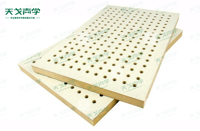 天戈孔狀吸音板飾面顏色及材料選擇性廣,孔徑、孔距可根據客戶要求調整,能很好地滿足客戶多樣化的聲學及裝飾需求。孔木吸音板對吸聲頻譜選擇性較強,對中低頻有很好的吸聲性能。如在吸聲結構后空腔上填入適量的吸聲棉可提高中、高頻吸聲效果。