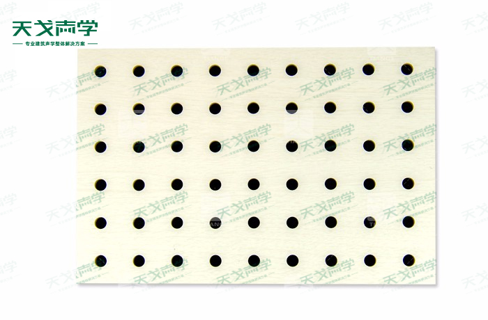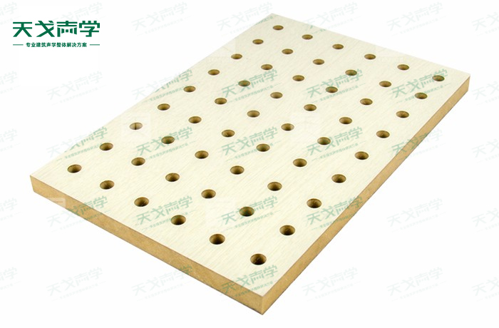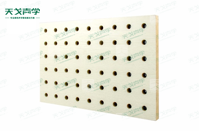 天戈環保孔木吸音板飾面顏色及材料選擇性廣,孔徑、孔距可根據客戶要求調整,能很好地滿足客戶多樣化的聲學及裝飾需求。環保孔木吸音板對吸聲頻譜選擇性較強,對中低頻有很好的吸聲性能。如在吸聲結構后空腔上填入適量的吸聲棉可提高中、高頻吸聲效果。