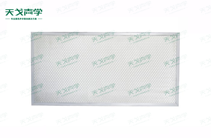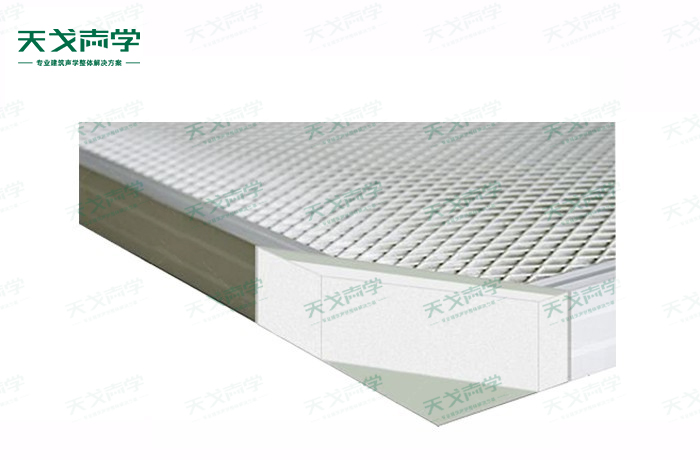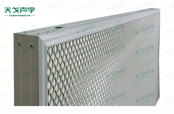 結構——四周鋁合金框內置歐文斯科寧吸聲棉,外包吸聲玻纖難燃/不燃吸聲布,加鋁網飾面構成