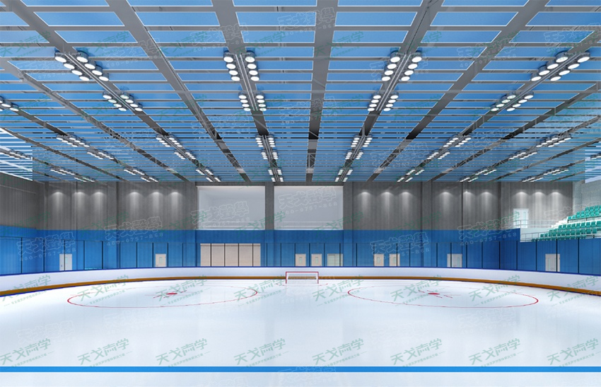 因冰球館內(nèi)存在顫動回聲、聲聚焦和回聲等聲學(xué)缺陷,需要對聲學(xué)材料進行合理布置,以達(dá)到消除各種聲學(xué)缺陷。為使該冰球館內(nèi)混響時間能達(dá)到合理水平,我們天戈聲學(xué)對該冰球館提出了相應(yīng)建筑聲學(xué)設(shè)計方案,最終使該體育館獲得了良好的音質(zhì)效果。我們選擇在冰球館墻面安裝藍(lán)色槽鋁吸音板,可以消除比賽池的顫動回聲。天花同樣懸掛藍(lán)色空間吸聲體,以便有效地降低了館內(nèi)的混響時間,同時大幅削弱頂棚聲反射能力,消除了頂棚多重回聲問題。