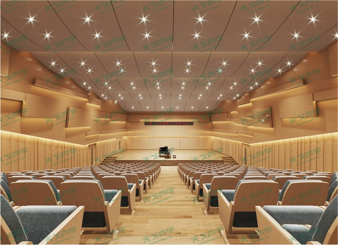 音樂廳聲學設計中的天花、墻面是重點,該音樂廳在聲學材料的使用上分別是:天花使用天戈聲學的GRG材料,墻體使用天戈聲學的mls擴散體。除此之外還有天戈聲學其他的一些輔助材料。