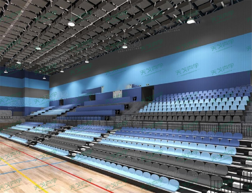 方案設(shè)計(jì)中,聲學(xué)方面采用了藍(lán)色的槽鋁吸音板作為場所主要的吸音材料,能很好的降低場所的中低頻段的混響,并通過有效的計(jì)算,在頂面安裝一定的低頻空間吸聲體對低頻聲能進(jìn)行補(bǔ)充吸收。空間裝飾上,結(jié)合學(xué)校茁壯成長、人杰地靈的元素。營造一種流水般靈動(dòng)的氛圍。