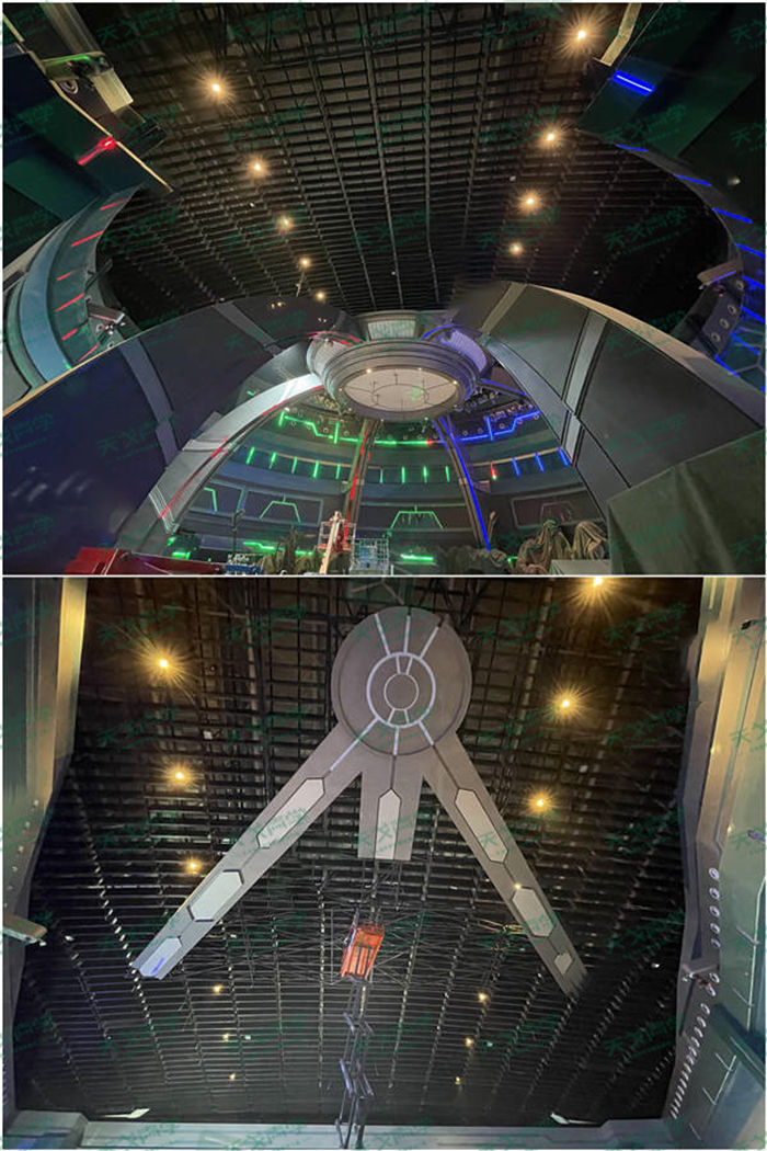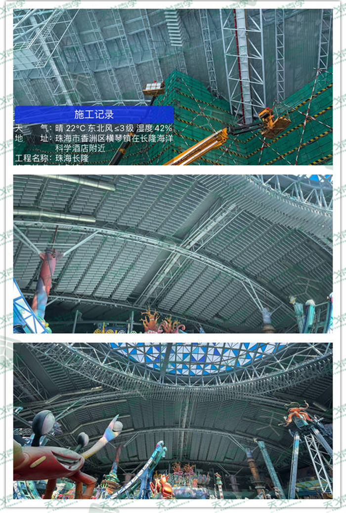 技術難點:大魚館最高度達到48米,安裝困難,天戈裝飾團隊研究決定使用長避車施工。兒童場館有很多兒童設施,活動困難,天戈裝飾團隊研究決定采用增加人員行走人架的安裝方式。長隆的施工要求比較高,所有配件的安裝和間距都要達到國家的標準,但專業的天戈聲學裝飾團隊按照標準一一完成。項目所有鋼材必須防銹、抗氧化。迎賓入口廳堂,高度32米左右,中心區域有一個八爪型的裝飾造型,導致施工難度增加,天戈聲學裝飾團隊研究決定使用的安裝方式是長避車+人工支架行走的安裝方式。面對多個工程技術難題,天戈聲學裝飾團隊都逐一解決,因為我們堅信沒有解決不了的難題,不管多大的問題,我們都會磕到底。