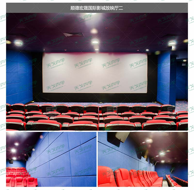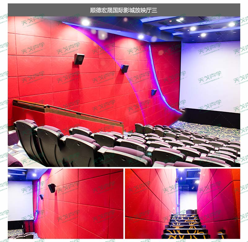 經研究決定,該影城采用了天戈聲學生產的軟包吸音板2000多平方米,利用軟包吸聲材料消除觀眾廳聲聚焦、顫動回聲、多重回聲等聲學缺陷;減少了噪聲對擴聲系統的聲干擾,營造了一個良好的視聽效果。項目完工后得到客戶的一致認可與好評!